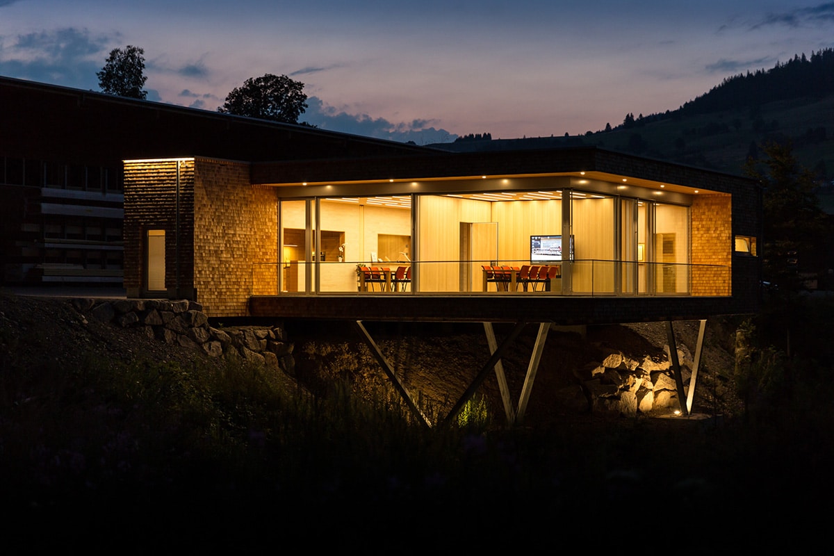 Unser hauseigenes Planungsbüro entwarf einen Holzkubus, dessen Schindelfassade auf moderne Weise an Schwarzwälder Bautradition erinnert. Den Eindruck beim Betreten dominiert das Material Holz und einen besonderen Effekt schafft die raumhohe, zweiseitige Glasfassade, die einen herrlichen Blick in den umliegenden Schwarzwald und somit den uns so wichtigen Baustoff Holz freigibt. Dieser Anblick hat schon den ein oder anderen Kunden sprachlos werden lassen. Der vorgelagerte, umlaufende Balkon mit Ganzglasbrüstung verstärkt diesen Eindruck und die schwebende Wirkung des auf schrägen Stahlstützen ruhenden Gebäudes noch.